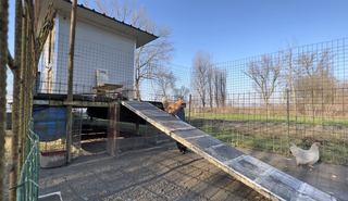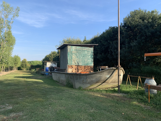 Tùrel takes us to see his cement barge placed on a grassy meadow running towards the main embankment, next to his small house. Then he tells us that he recovered it, before 2000, at Bocca d'Enza by tying it to a boat 'in the right place'. When he arrived in the area, when the level of the Po covered the path, he and some friends dragged it to the place where they could put it. How? Says Turèl: "Cun an šög ad sùghi, an toc alla volta, a la ligaum a tac a li pianti e la tiraum avanti" (With a game of big ropes, one stretch at a time, we tied it to the trunks of the trees and dragged it forward). Remembering that we are in a floodplain area, the barge was anchored to two piles that sank one metre underground in holes made with an auger. Two concrete drums filled with sand were placed on the bottom for safety. The piles are used for the barge to slide up and down in the event of a flood of the Po. The barge measures 14 metres and weighs 200 quintals. Turèl turned it into a woodshed with a floating raft with a chicken coop on top. The woodshed consists of an iron cage in the shape of a tall parallelepiped where the wood is piled up. He shows us the cameras he has placed on the poles 'parché chē i ciava töt: la legna, li galini' (because here they steal everything, the wood, the chickens), says Turèl. "E pō a ghè anca i can ca distürba e li vulp cam magna li galini" (and then there are also the dogs that disturb and the foxes that eat my chickens). The hens are at large during the day. They can be seen scratching around in the meadow. Turèl says that the biggest and fattest ones will be used for broth, the smallest ones called 'i'amaricanini' (American hens) he keeps for beauty, says Turèl. Then Turèl points out that he keeps two cocks against all odds in a henhouse, which is also a figure of speech, because he likes them and doesn't feel like getting rid of one. Says Turèl: 'Me ag dic gnint, a voi chi smeta dacordi tra lor dü !' (I don't tell them anything, I want the two of them to come to an agreement!). We are still chatting next to the raft when at a certain point I notice that the chickens begin to approach us and enter through an opening in the cage on the raft where there is a little house: al pulèr. No one has called them. I ask Turèl for an explanation. Says Turèl: "A gò insgnà me: a quatr e mesa circa li gà da turnà in dal pulèr! (I have instructed them: at about half past four they must go back into the chicken coop!).